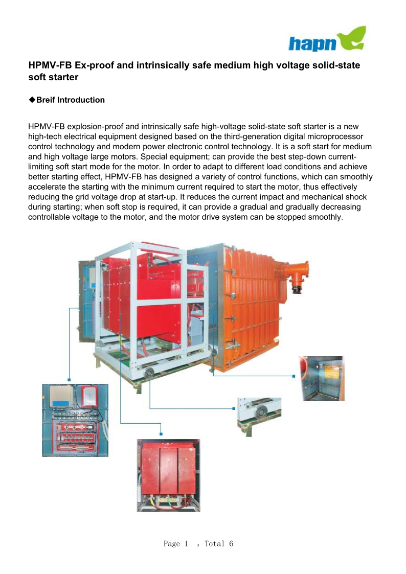 HPMV-FB explosion-proof and intrinsically safe high-voltage solid-state soft starter is a newhigh-tech electrical equipment designed based on the third-generation digital microprocessorcontrol technology and modern power electronic control technology. It is a soft start for mediumand high voltage large motors. Special equipment; can provide the best step-down current-limiting soft start mode for the motor. In order to adapt to different load conditions and achievebetter starting effect, HPMV-FB has designed a variety of control functions, which can smoothlyaccelerate the starting with the minimum current required to start the motor, thus effectivelyreducing the grid voltage drop at start-up. It reduces the current impact and mechanical shockduring starting; when soft stop is required, it can provide a gradual and gradually decreasing