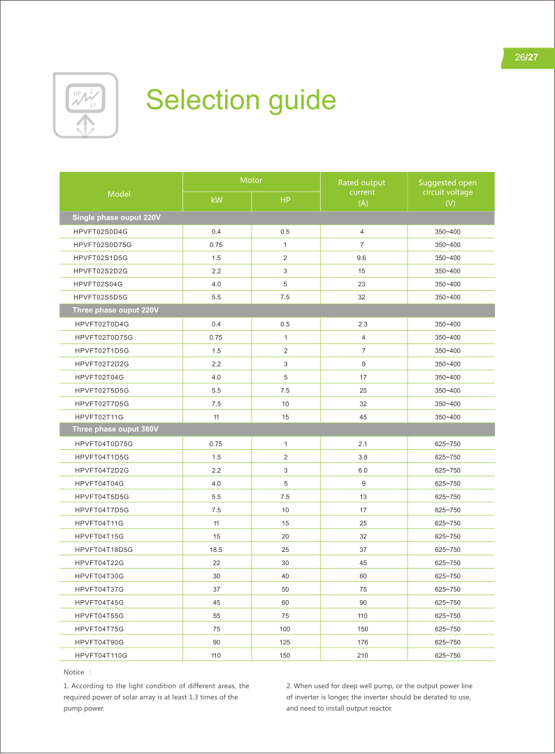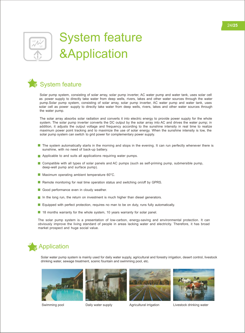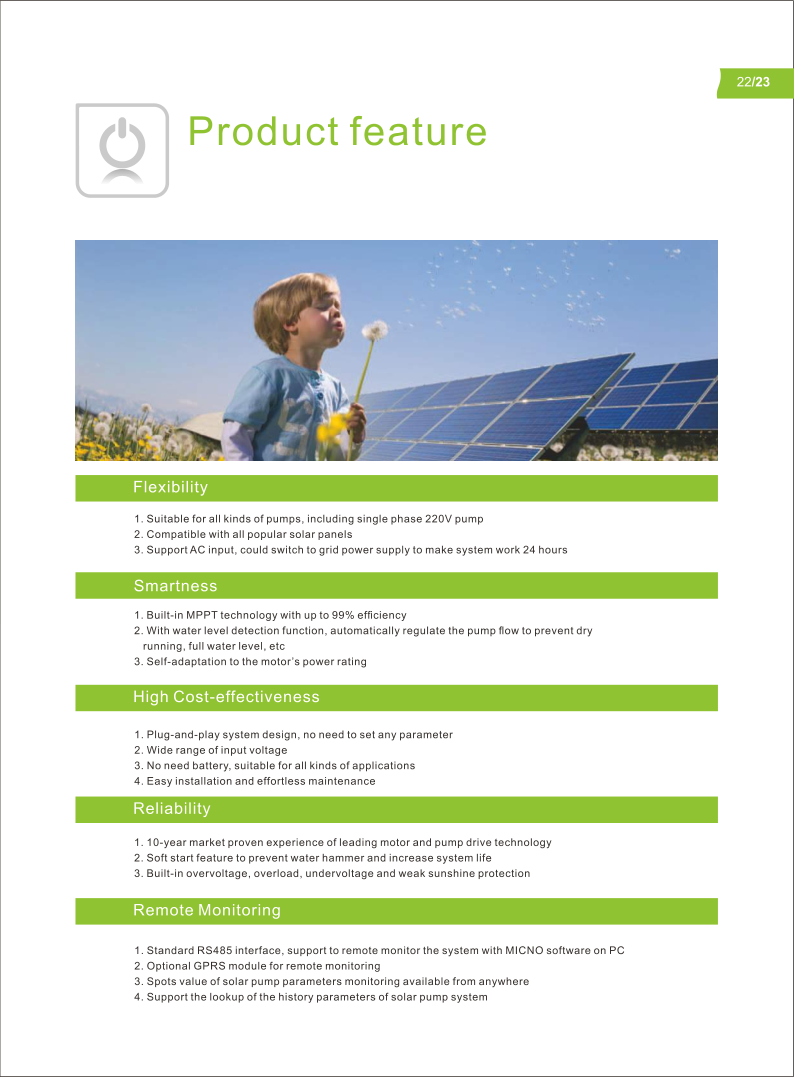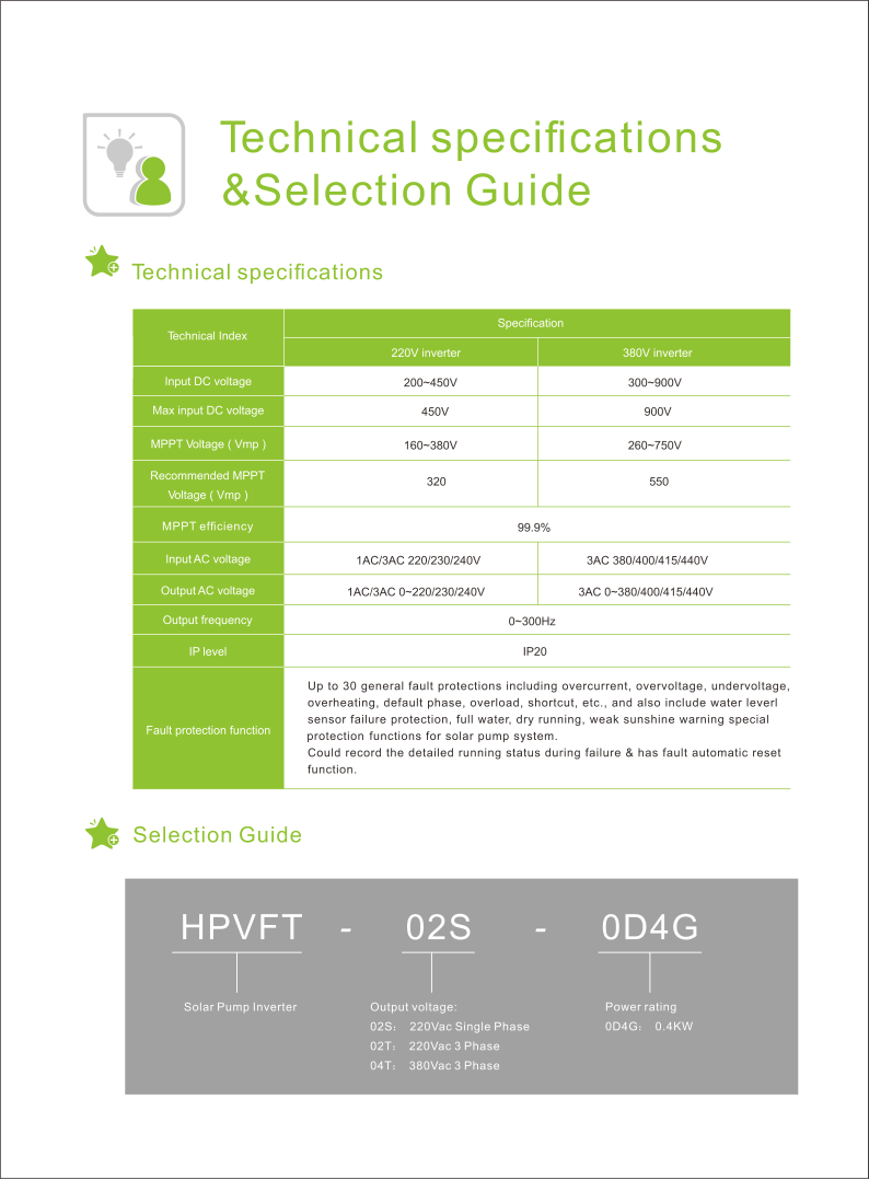 HPVFT inverters are equipped with overall protectionfunction (self-checking functions for dry running,weaksunshine,full water level, etc.),motor soft start andspeed control functions, with perfectfunction,easyoperationandinstallation.