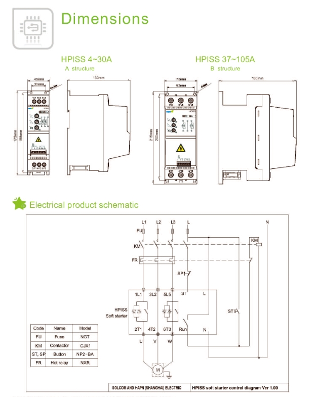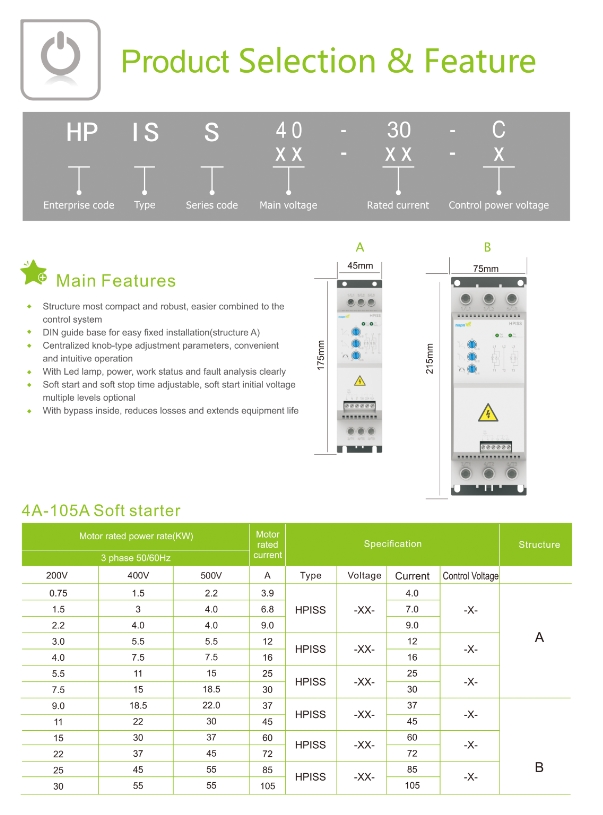 HPISS is a miniature digital soft starter specially designed for three-phase small squirrel cage motors. It can flexibly realize soft start and soft stop, and the soft start and soft stop are adjustable. The soft start initial voltage (initial torque) is available in multiple levels. This greatly reduces the impact of current and mechanical torque when the motor starts, protecting the safety of motor equipment and power supply networks. It can be widely used in various small motor devices, such as industrial and commercial air conditioners, refrigerators, freezers and water pumps, etc. In the control system, users can reduce the quality requirements of the power supply network, reduce the burden on the power grid and extend the service life of the equipment.