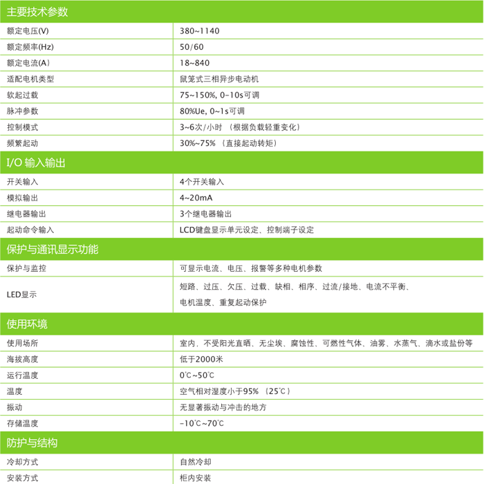 對電網(wǎng)及機(jī)械設(shè)備沖擊小等優(yōu)點(diǎn),是傳統(tǒng)起動(dòng)方式理想的更新?lián)Q代產(chǎn)品。適用于石油、冶金、礦山、選煤廠含有爆炸性氣體(甲烷)和煤塵的煤礦井下的重載或使用條件惡劣的三相異步電動(dòng)機(jī)的軟起動(dòng)、軟停車控制。